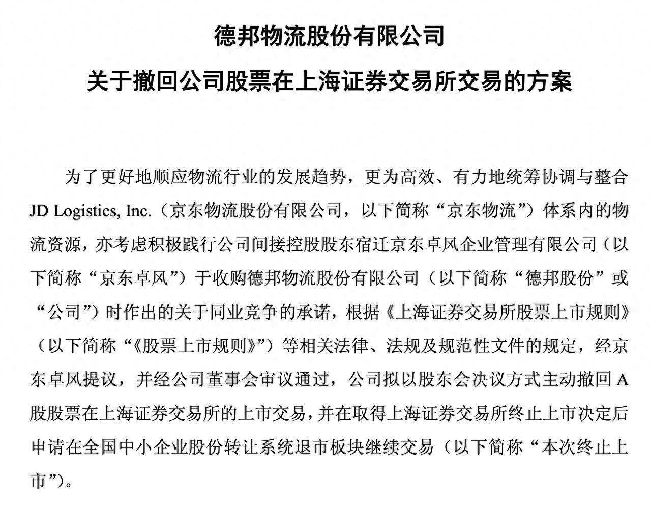 根据公告,为了更好地顺应物流行业的发展趋势,更为高效、有力地统筹协调与整合JD Logistics,Inc.(京东物流股份有限公司,简称“京东物流”)体系内的物流资源,亦考虑积极践行公司间接控股股东宿迁京东卓风企业管理有限公司(简称“京东卓风”)于收购德邦股份时作出的关于同业竞争的承诺,根据相关法律、法规及规范性文件的规定,经京东卓风提议,并经公司董事会审议通过,公司拟以股东会决议方式主动撤回A股股票在上海证券交易所的上市交易,并在取得上海证券交易所终止上市决定后申请在全国中小企业股份转让系统退市板块继续交易。