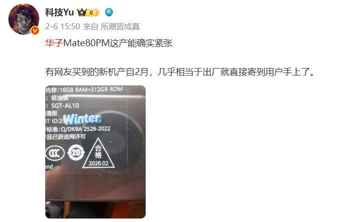 【CNMO科技消息】近期,华为Mate 80 Pro Max的供应情况成为市场焦点。有博主在微博上分享称,一名网友新购入的华为Mate 80 Pro Max的生产日期为2026年2月,几乎实现了“出厂即达”。