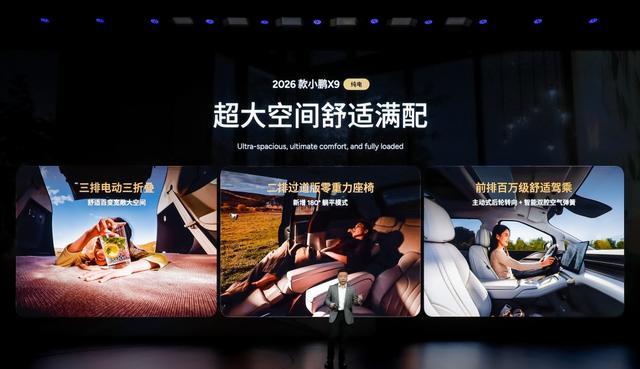 内饰方面,新车延续了现款车型的布局,配备10.25英寸全液晶仪表盘和17.3英寸悬浮式中控屏,搭配双色双辐式多功能方向盘。内饰颜色提供云间玫棕、月影咖以及气宇灰共3种可选。舒适性配置上,2026款小鹏X9进行了针对性升级,全系标配RNC主动降噪和前排电吸门。第二排配备零重力座椅,并新增腿托加热功能。官方特别强调,新车全球首发第三排电动折叠功能,进一步提升了空间变换的便利性。其他配置方面,新车前排提供无线充电面板与双杯架,二排搭载21.4英寸娱乐屏,共同营造舒适的乘坐体验。智能座舱方面,新车匹配AI天玑6.0智能座舱,支持智能迎宾、智能充电推荐等主动服务,并配备OMS智能座舱看护功能。