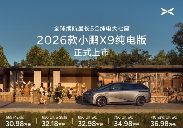 3月2日,2026款小鹏X9纯电版正式上市。新车共推出5款车型,售价区间为30.98万-36.98万元。此外,2026款小鹏X9超级增程版还新增上市了一款1602 Ultra SE车型,售价为32.18万元。作为年度改款,新车在外观细节小幅调整的基础上,核心升级点在于全系标配图灵AI芯片与第二代VLA物理世界大模型,并延续了800V平台与5C超充电池的组合,智驾能力与综合产品力得到全面提升。